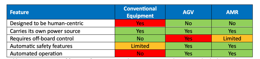 表中的简单颜色编码显示,根据突出显示的功能,AMR 提供的优势最大。当然,还有其他考虑因素,例如总拥有成本和维护成本。然而,预计 AMR 或 AGV 的成本将低于叉车,这意味着在工作生命周期内摊销的拥有成本也将更低。