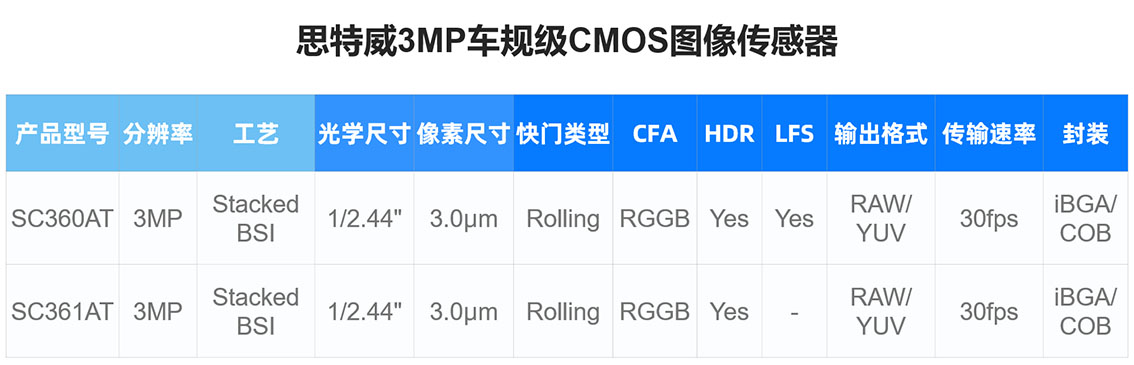 思特威产品市场副总裁石文杰表示:“SC360AT是思特威首颗采用CarSens®-XR Gen 2工艺技术打造的Stacked BSI + Rolling Shutter架构图像传感器产品。作为3MP车规级图像传感器新品,SC360AT搭载了SuperPixGain HDR™ 2.0、LFS等多项思特威先进技术,在感度、动态范围、噪声抑制、LED闪烁抑制等方面均具备出色表现,能为车载侧视/后视/环视摄像头等应用提供可靠、清晰、准确的实时影像。思特威旗下的车载(AT)系列图像传感器产品覆盖1MP~8MP分辨率,适配ADAS、感知与舱内三大应用场景需求。未来,思特威将持续扩展AT系列产品矩阵,以更多高性能、高可靠性的车规级图像传感器产品,助力智能汽车应用的进阶发展。”