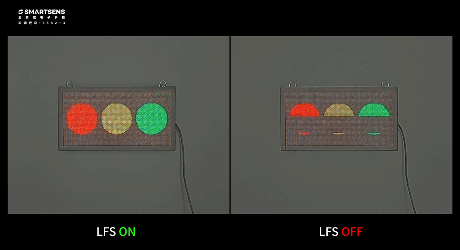 当车辆处于道路行驶过程中,交通信号灯、LED车灯等LED照明设备的LED闪烁现象,会对车载摄像头CIS的画面拍摄效果造成干扰,导致CIS成像画面出现条纹、闪烁光斑等现象,影响驾驶员、辅助驾驶系统对交通路况的判断。SC360AT搭载了思特威自主研发的LFS技术(LED闪烁抑制技术),通过调整部分像素的曝光时长来覆盖LED频闪间隙,最终得到无LED闪烁的完整影像信息,能帮助ADAS系统准确识别交通信号灯、附近其他车辆的车灯颜色和状态并做出及时决策。