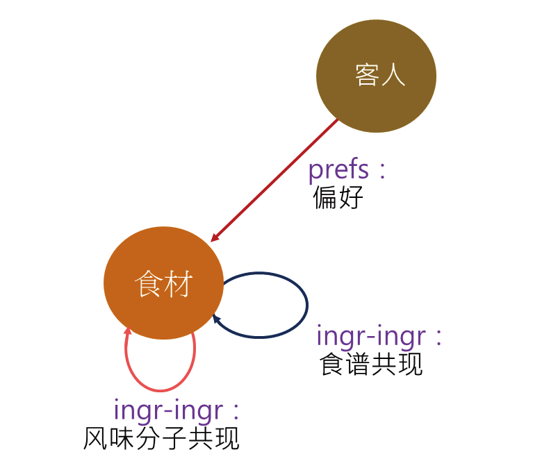 ● 使用场景:当两种食材具有类似的化学风味分子(Flavor compounds),这FlavorGraph就会建立一条ingr-i表示它们可能能够很好地搭配(互补)。