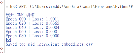 于是,训练好了中游KG模型,并且生成各节点的嵌入表示,储存于mid_ingredient_embeddings.csv档案里。