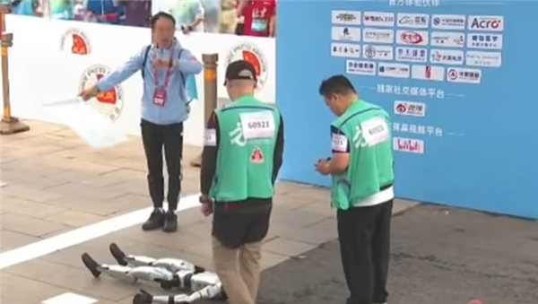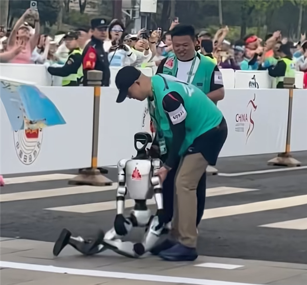 网传视频显示,宇树科技G1人形机器人刚起跑就摔倒在地,随后站起继续比赛。