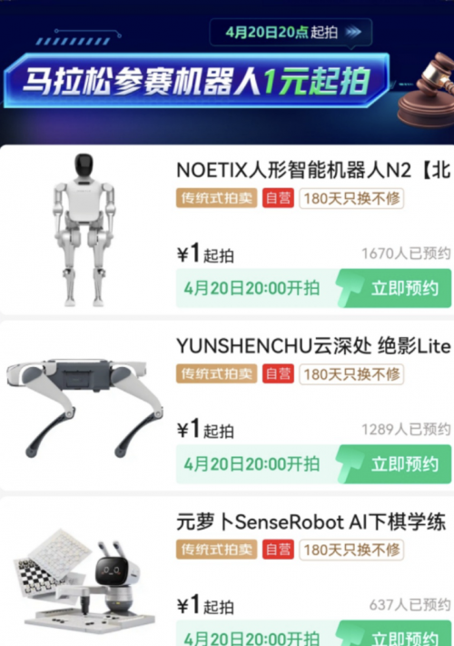 值得关注的是,4月20日晚8点,京东将举办全国首场人形机器人专场拍卖会,松延动力N2机器人、云深处Lite3四足机器人、元萝卜AI下棋机器人等多款智能机器人产品将以“1元起拍”的价格进行拍卖,用户可通过京东平台搜索“京东拍卖”开启预约。