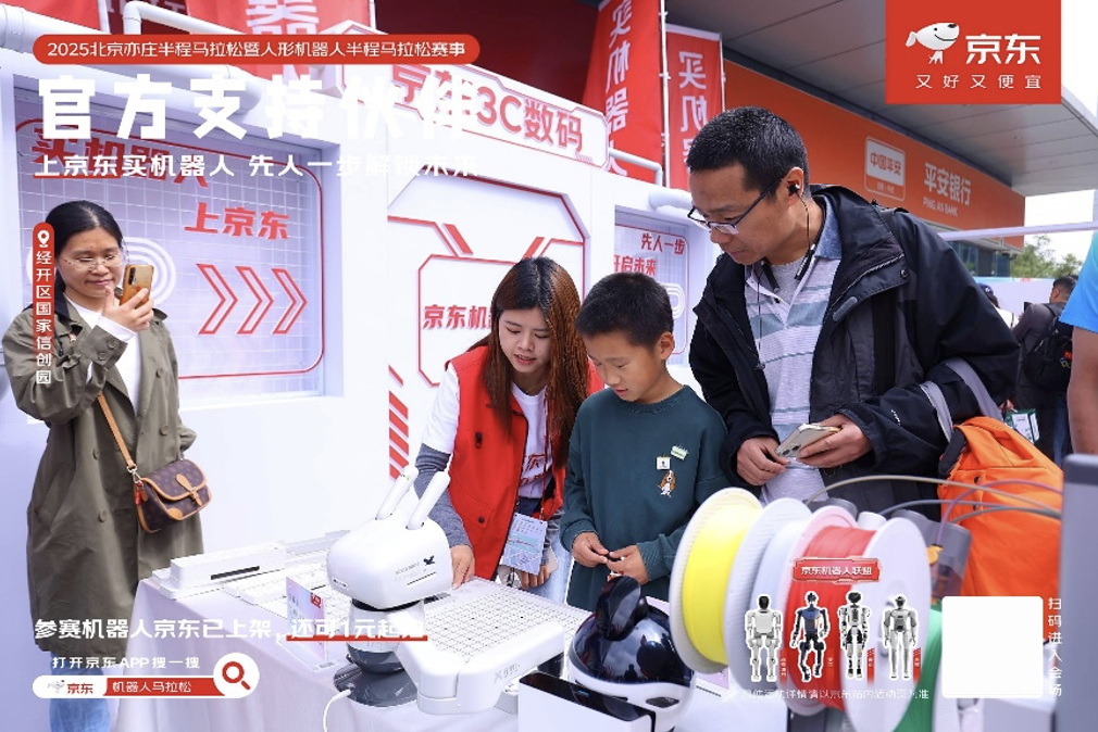 4月19日,2025北京亦庄半程马拉松暨人形机器人半程马拉松鸣枪开跑,天工机器人率先冲过终点线,斩获机器人组冠军,松延动力N2机器人紧随其后获得亚军。作为赛事官方支持伙伴,京东与天工、松延动力、青心、灵宝等在内的20余家智能机器人品牌共同见证了这一历史时刻。赛事当天,京东在比赛现场设置了机器人展台,集结了人形机器人、机器狗等产品,无论是跑友还是观众,都可以与机器人近距离接触。值得关注的是,本次参赛的多个智能机器人产品将在京东先人一步首发上线,更有机器人将以“1元起拍”的亲民价格在京东进行专场拍卖,为消费者带来前所未有的科技体验。