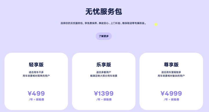 但驾享服务也不是完全免费的,萤火虫官网的驾享服务包有 499 / 1399 / 4999 三档可选。