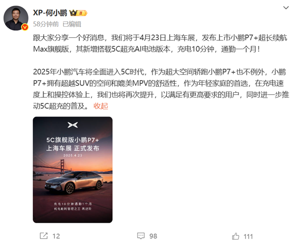 快科技4月21日消息,小鹏汽车董事长何小鹏今日发文宣布,小鹏将于4月23日上海车展,发布上市小鹏P7+超长续航Max旗舰版,其新增搭载5C超充AI电池版本,充电10分钟,通勤一个月。