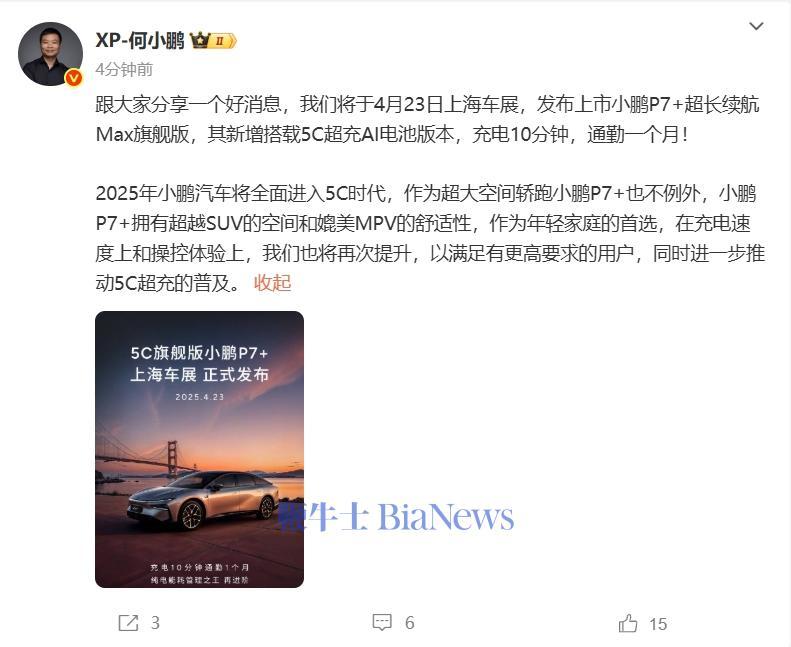 4月21日,小鹏汽车董事长何小鹏在微博发文称,小鹏汽车将于4月23日上海车展,发布上市小鹏P7+超长续航Max旗舰版。