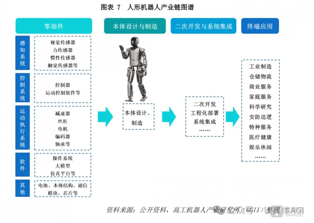 目前,人形机器人大体包括九个部分,涵盖零部件、本体设计与制造、二次开发与系统集成、终端应用等产业链体系:1、伺服驱动器,也就是机器人的“关节”;2、运动控制研发;3、位控和力控;4、全身柔性控制;5、机器人的工作能力,如手眼协调、抓取、力位混合控制、精度的控制和配合;6、导航算法;7、生物特征识别;8、多模态的交互;9、机器人操作系统。