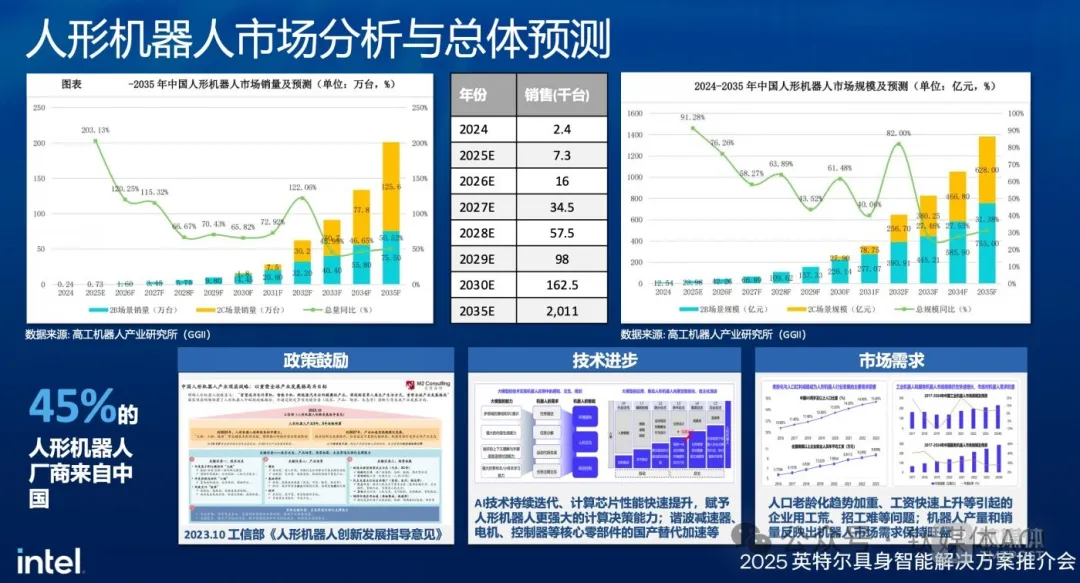 4月18日,钛媒体AGI从2025英特尔具身智能解决方案推介会上获悉,高工机器人产业研究所(GGII)数据显示,2024年,中国人形机器人市场预估销售量达2400台(指具有双臂、头部和双腿形态的机器人),而2025年的市场销量将达到7300台,市场规模有望接近24亿元;预计到2035年,人形机器人进入快速起量期,有望达到200万台左右,届时市场规模有望接近1400亿元。
