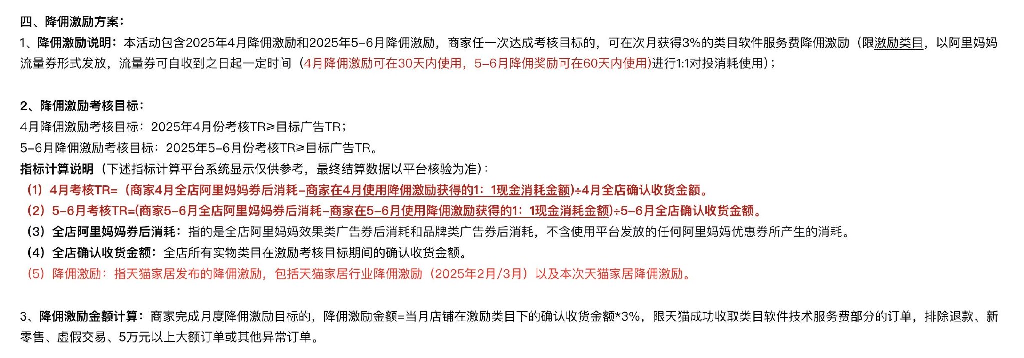 以4月降佣激励考核目标为例,上述规则要求2025年4月份考核TR要高于等于目标广告TR。(TR代表转化率,高TR意味着广告能有效推动用户下单。)5-6月的降佣激励考核目标于四月同理。相关指标计算说明如下: