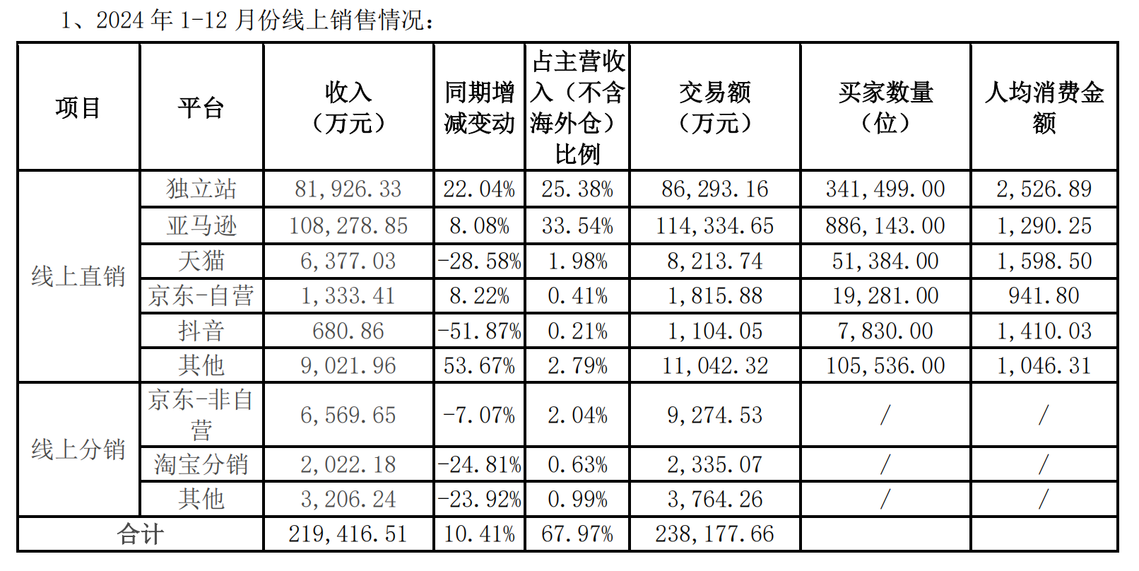 3、线上销售。乐歌境内、境外线上销售主要通过独立站和大型电商平台进行,如境内的天猫、京东、小米有品;境外的Amazon、 公司的独立网站、HomeDepot、OfficeDepot、Wal-mart、乐天、雅虎、Wayfair、eBay等电商平台。