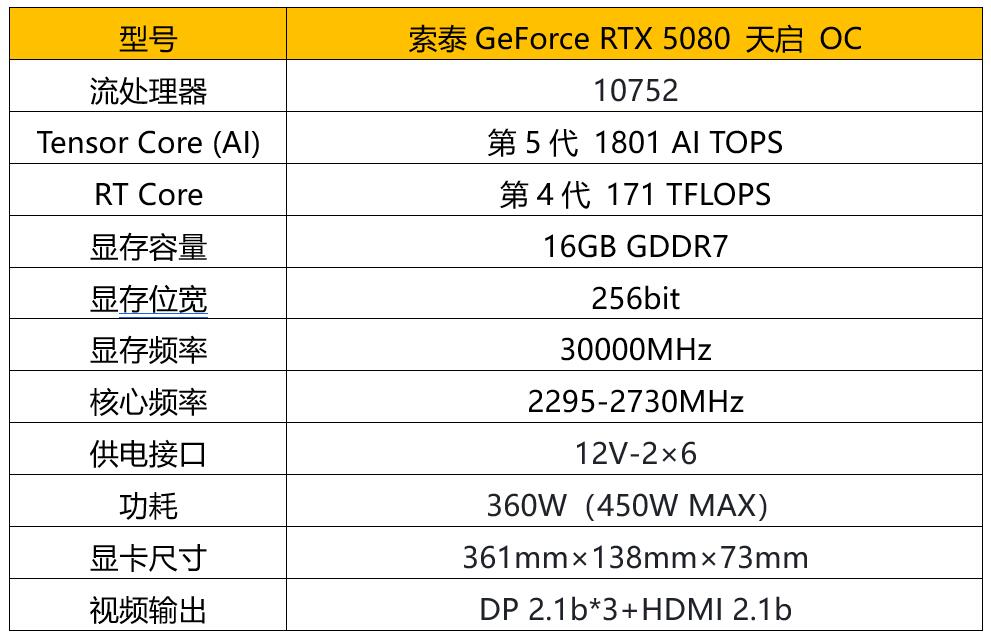 索泰RTX5080天启OC显卡全新升级的机甲风设计,在沿袭天启系列经典机甲设计的同时,通过白黑金三色的搭配,演绎出系列过往不曾有的优雅与精致;16GBGDDR7规格的高速率显存,能轻松应对AI训练以及创意工作流;旗舰级的堆料和供电设计,搭配上特挑的GPU核心,也成就了这张显卡不俗的超频表现;再加上优秀的温度和噪音控制,使得RTX5080 天启OC几乎做到了全方位无短板的“水桶型”显卡,对于追求极致体验的玩家与创作者而言,索泰RTX5080天启OC显卡无疑是一个非常不错的选择。