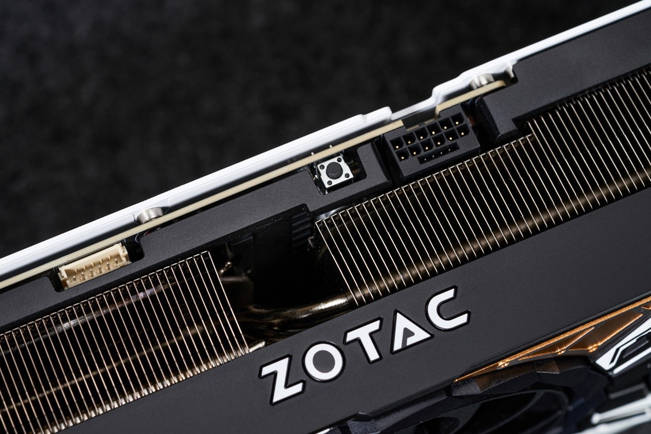 显卡的侧面和尾部都使用了全包围设计,侧面的“ZOTAC”品牌LOGO信仰灯,简约而内敛,且与正面的“启世之环”相呼应,两者均可以通过OPENARGB幻光同步接口来实现与主板同步。尾部还有一块制作成“天启”二字形状的金属铭牌。