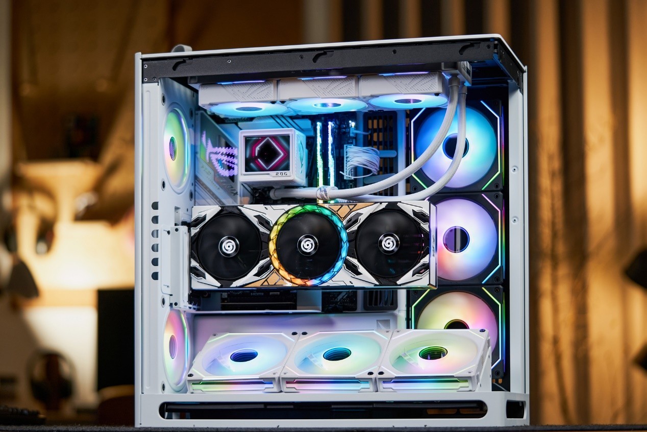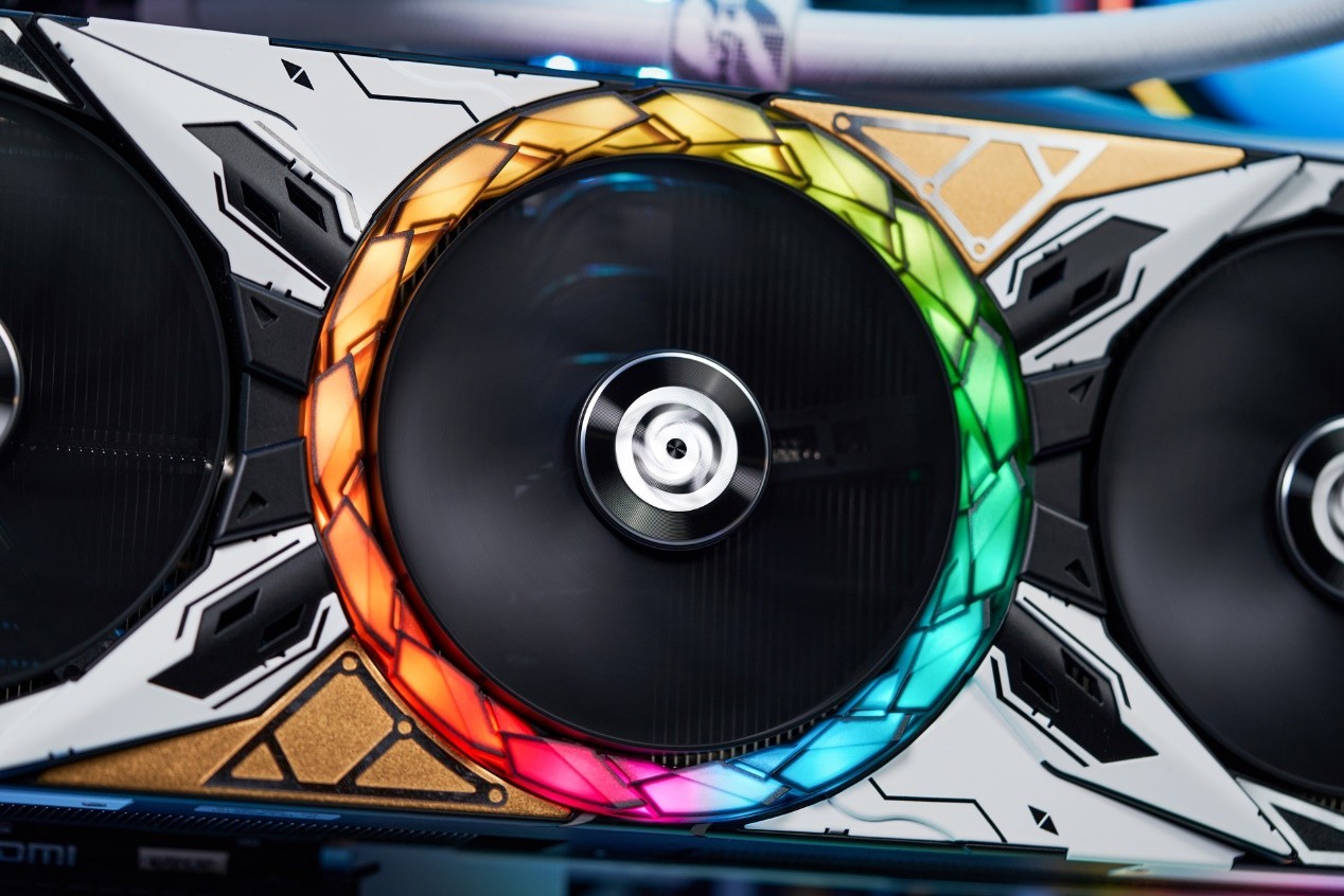 索泰的RTX5080天启OC显卡与国内工作室“贝尔MODStudio”合作,融入机甲风格的棱角切割和机械纹理。采用了“白金黑”三色组合,以白色为主色调,搭配黑色大底强化整体的结构感,再辅以金色装饰点缀,形成强烈的视觉对比,富有工业美感。显卡正面最中央的风扇周围是天启系列的标志性设计——“启世之环”,半透明的黑色环状构件上做了钻石切面设计,进一步提升灯环点亮后的色彩氛围。