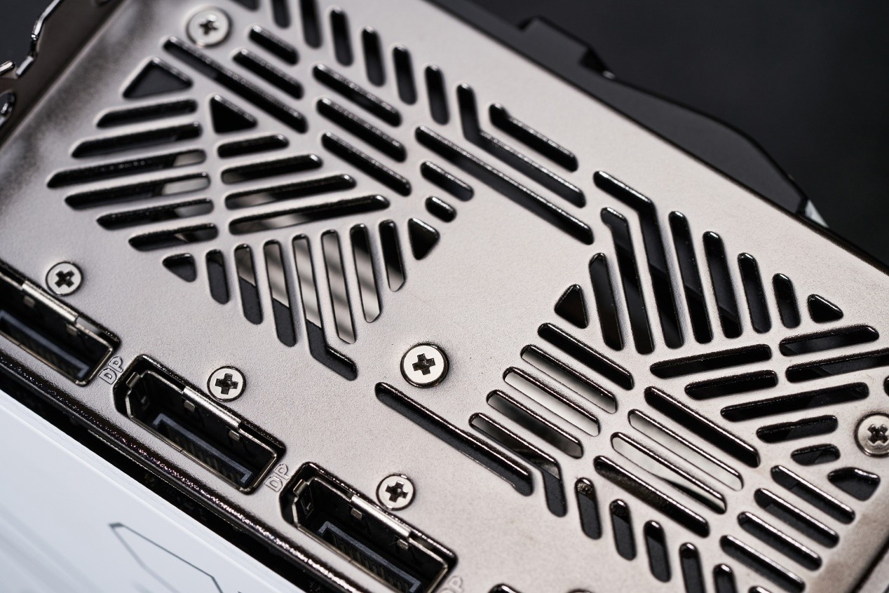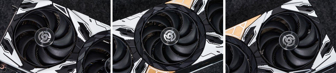 正面中央是三把直径10cm的高性能环刃风扇。扇叶末端增加了环形导流风罩,配合高强度的新型复合材质和优化后的叶片曲率,可以增加风扇的结构稳定性,降低风噪,并且提升风量和风压,让气流能够更有力地穿透散热鳍片,提升显卡的散热效率。另外风扇还支持智能启停,可提供更好的低载噪音表现和延长使用寿命。