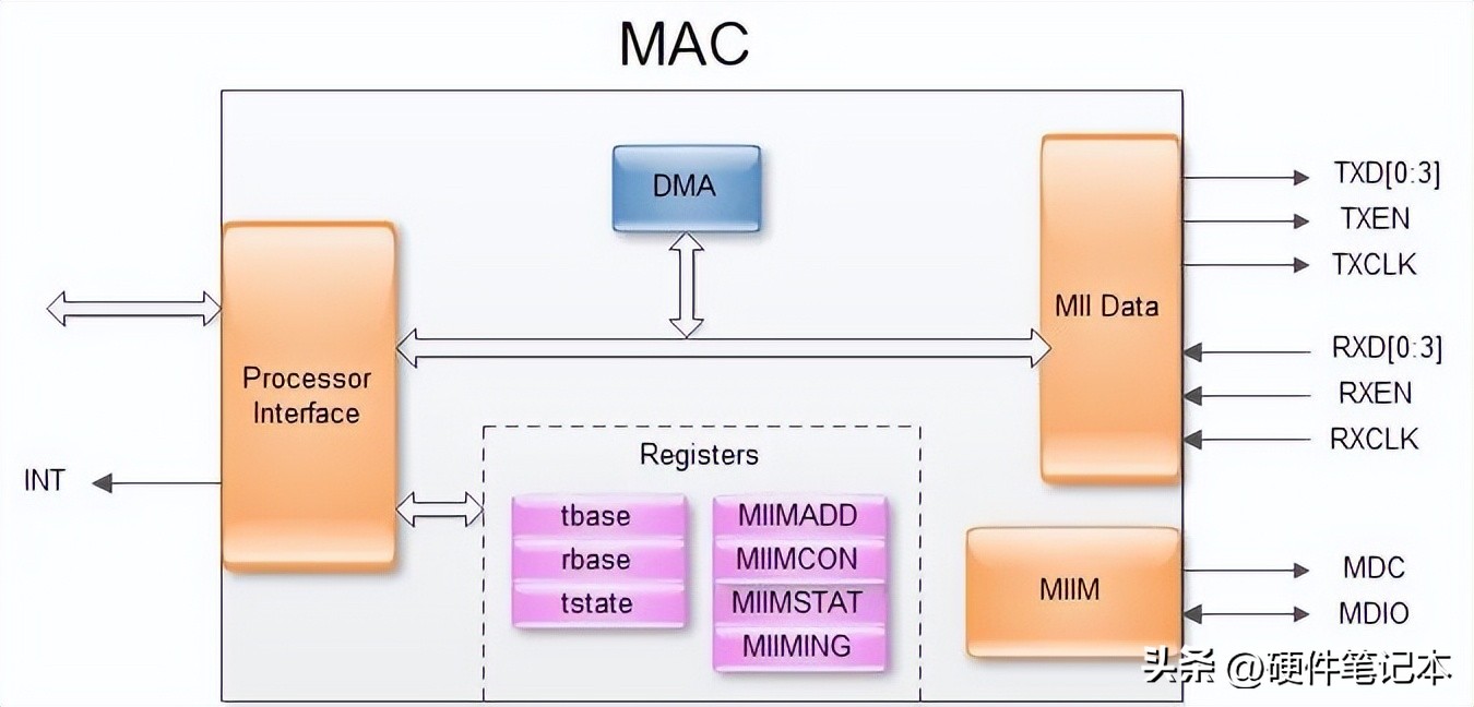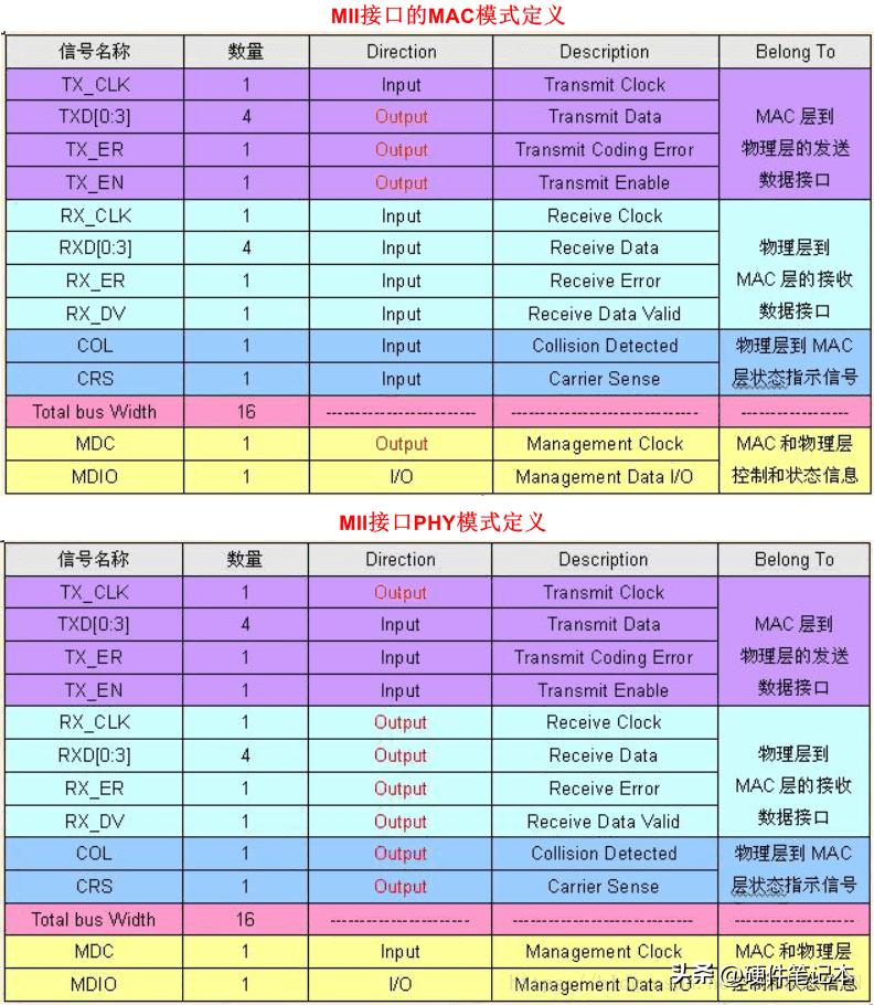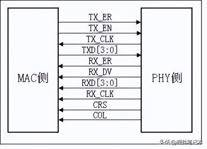 MII接口主要包括四个部分。一是从MAC层到PHY层的发送数据接口,二是从PHY层到MAC层的接收数据接口,三是从PHY层到MAC层的状态指示信号,四是MAC层和PHY层之间传送控制和状态信息的MDIO接口。