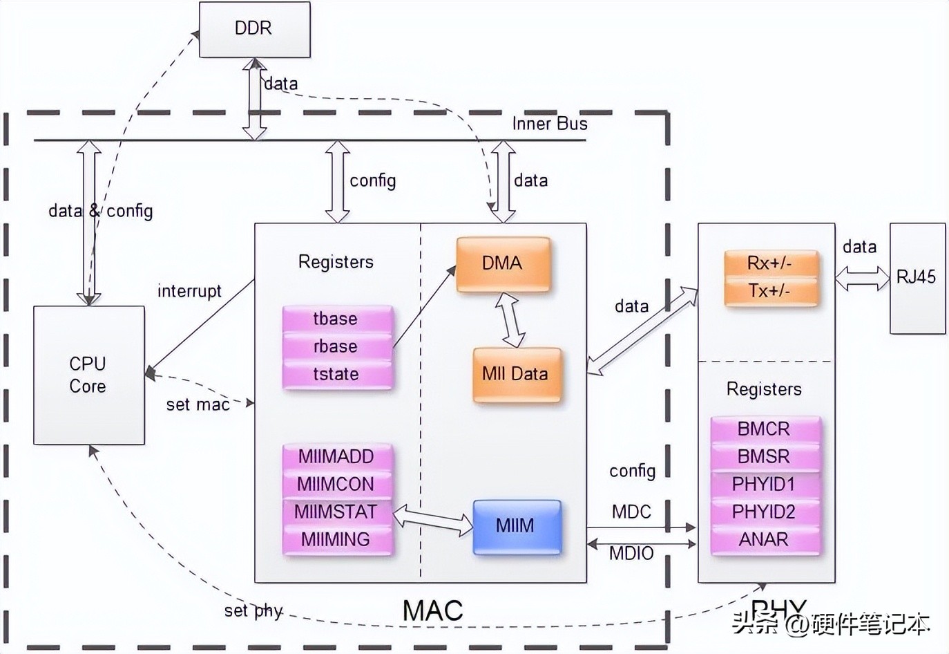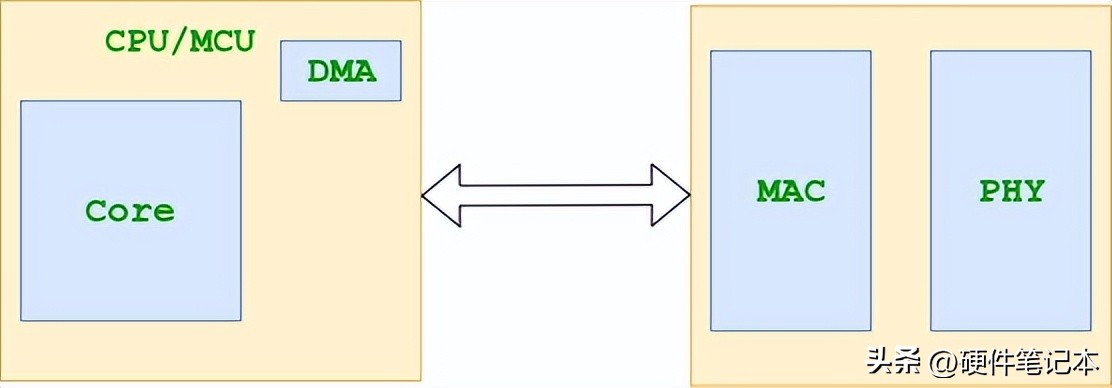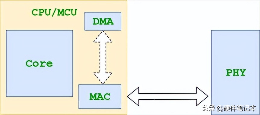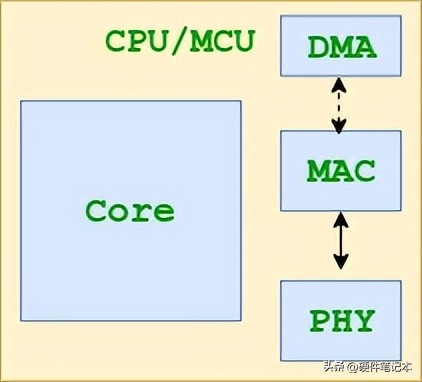 DMA控制器通常属于CPU的一部分,用虚线放在这里是为了表示DMA控制器可能会参与到网口数据传输中。但是,在实际的设计中,以上三部分并不一定独立分开的。由于,PHY整合了大量模拟硬件,而MAC是典型的全数字器件。
