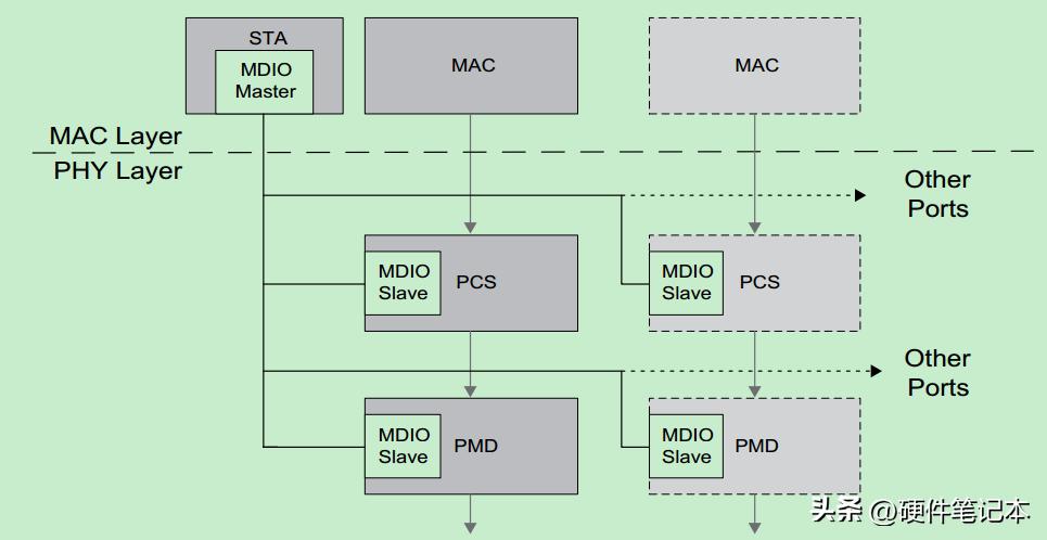 MDIO主机(即产生MDC时钟的设备)通常被称为STA(Station Management Entity),而MDIO从机通常被称为MMD(MDIO Management Device)。通常STA都是MAC层器件的一部分,而MMD则是PHY层器件的一部分。