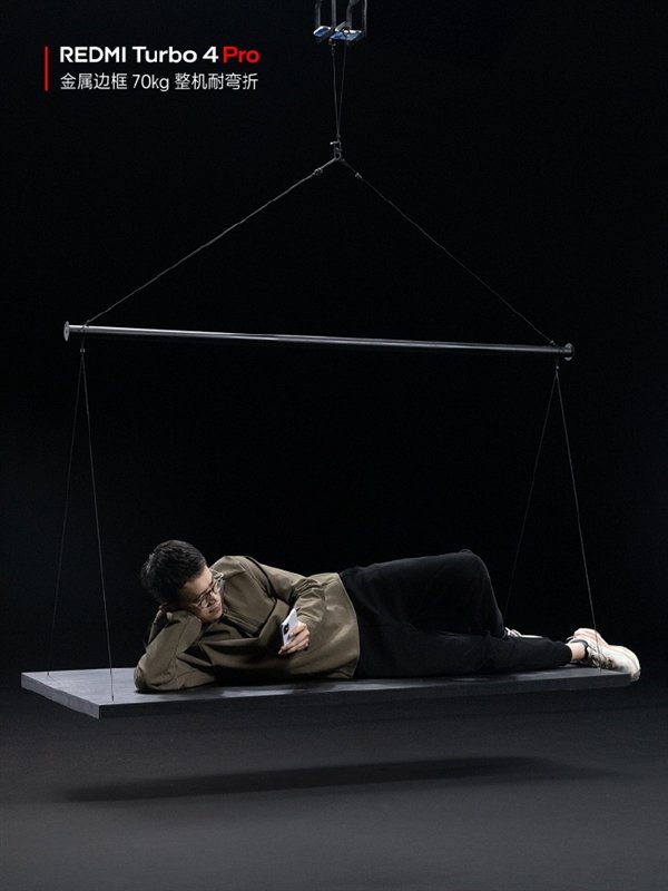 随后,REDMI品牌总经理王腾晒出一组照片并发文,称“研发同学说采用金属中框的Turbo4 Pro的抗弯折能力达到70Kg,正好我也差不多是这个体重,索性我就亲自测试了一下。”