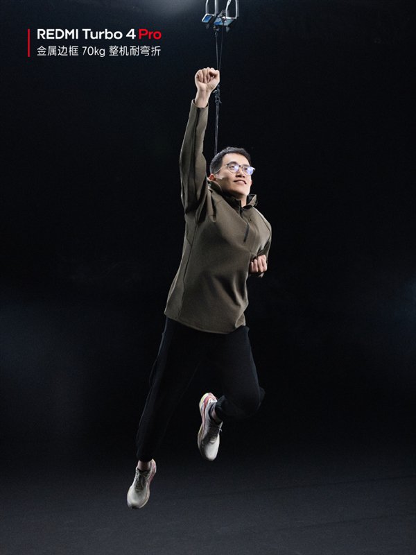 照片中,王腾吊威亚实测Turbo 4 Pro承重能力,得益于超强的金属中框,Turbo 4 Pro能够轻松承受他的重量。