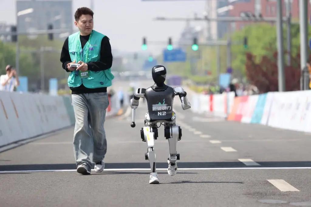 21.0975公里的赛道上,既有1.2万名人类跑者挥洒汗水,也有来自20余支队伍的机器人选手迈着机械步伐奋力前行。