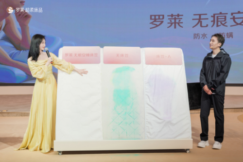 在发布会现场,罗莱事业部总经理 童伟明先生和景甜还共同进行了测试实验,亲自演示了这款床笠的防水透气以及防螨防尘等性能,景甜本人在现场不禁感叹:“这是让人特别安心的一个床笠,黑科技也很厉害!让人很心动!”她也希望大家每天都能有个好的睡眠,同时罗莱的产品能给大家带来更多的幸福美好的体验,让大家能睡得更好更安心。