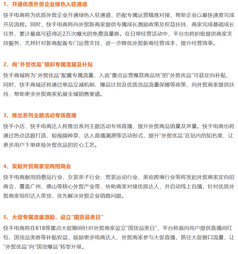 【亿邦原创】面对国际市场波动与国家提振消费的号召,快手电商近日重磅推出“外贸优品”专项扶持计划,通过五大核心举措打通外贸转内销的全链路。依托平台7亿用户生态与成熟的直播电商体系,快手电商将为优质外贸企业提供从入驻、流量到销售的一站式解决方案,帮助企业快速打开国内市场。