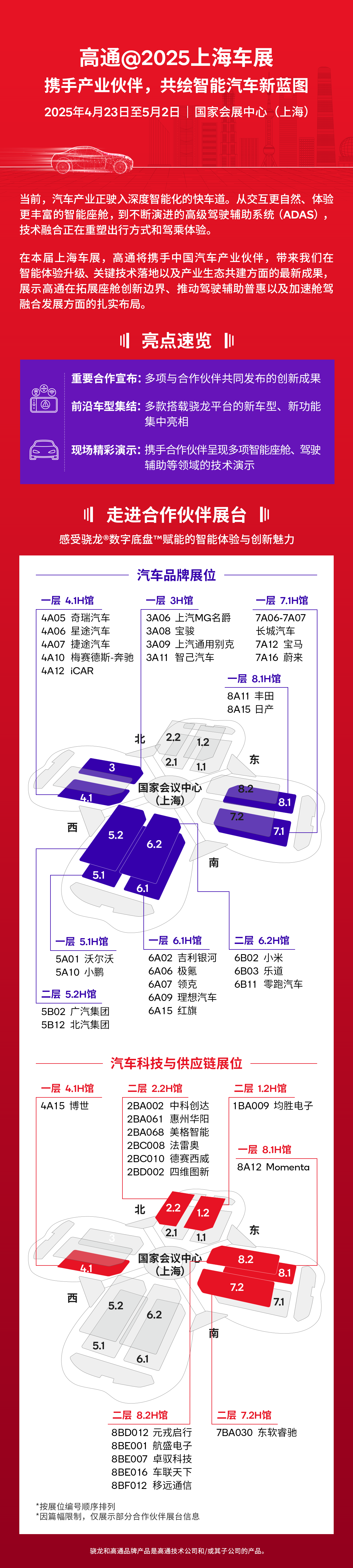 欢迎大家前往合作伙伴展台(各家展台信息,请查看附件长图),参观基于骁龙数字底盘解决方案打造的最新车型,深入了解由骁龙赋能的产品和创新成果,并持续关注高通在汽车领域的最新动态。