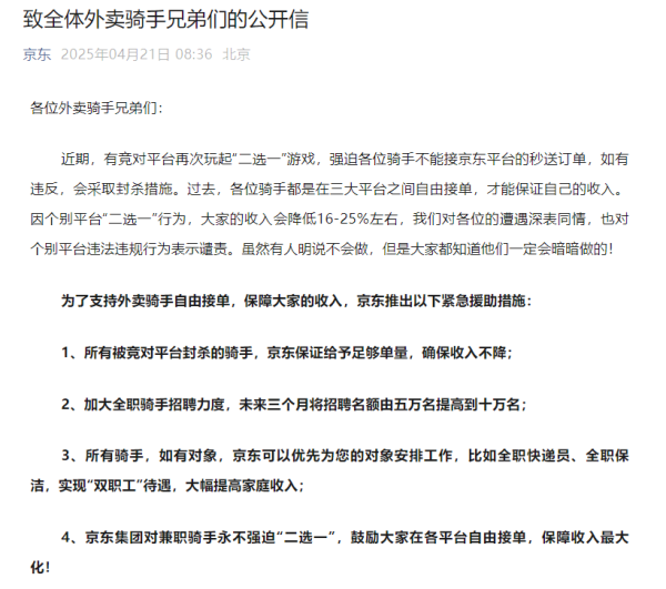 近日,京东发布了一封致全体外卖骑手兄弟们的公开信,针对竞对平台实行“二选一”政策对骑手收入造成负面影响的问题,提出了一系列紧急援助措施,并对相关平台进行了批评。这封公开信不仅体现了京东对外卖骑手群体的支持和关怀,更深层次地反映了其在当前竞争激烈的外卖市场上寻求突破的战略意图。