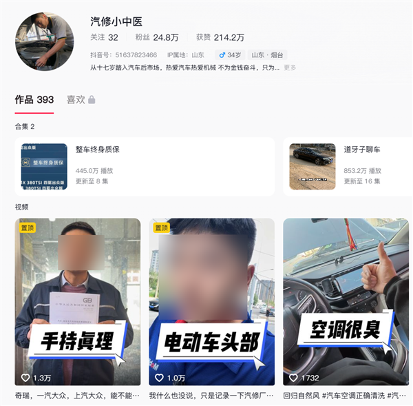 而抖音平台显示,自媒体“汽修小中医”是一位汽修博主,目前已有24.8万粉丝。