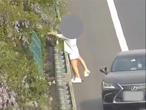 车门打开后,两位女子手提塑料袋,竟开始采摘路边的野花,这一行为不仅危险,还严重违反了交通规则。