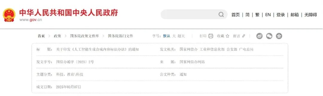 国家互联网信息办公室、工业和信息化部、公安部、国家广播电视总局就已经制定发布《人工智能生成合成内容标识办法》将于今年9月1日起施行。新规要求AI生成的包括文本、图片等内容,无论是展示还是下载导出等,都需要添加显著的提示标识,相当于给AI内容打水印,方便用户甄别。