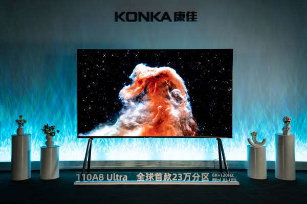 依托+AI,康佳集团实现了多场景的体验升级。今年在国际信息显示技术大会上大秀肌肉的110A8 Ultra电视基于康佳自研8K画质芯片,集成AI大模型超分算法和像素级光学引擎突破传统Mini LED背光方案极限,实现了23万分区的MiniLED背光分区控光,并于今年3月荣获2025 SID年度最佳创新显示应用技术奖金奖,为整个显示行业树立了新的技术标杆。
