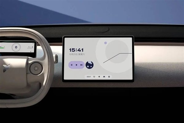 抛开车灯设计,萤火虫在车辆造型、座舱、UI 界面设计上协同度较高。三重奏大灯、灵动尾环、荧光胶囊贯穿整车设计,其在车机UI设计同样采用了圆形、胶囊型的设计,车内外的设计风格高度统一。