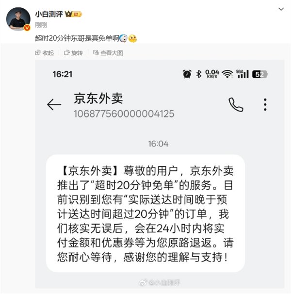 快科技4月21日消息, 今日,京东宣布,所有超时20分钟以上的外卖订单全部免单。对此,有博主晒出京东外卖发来的短信,并表示:“超时20分钟东哥是真免单啊”。