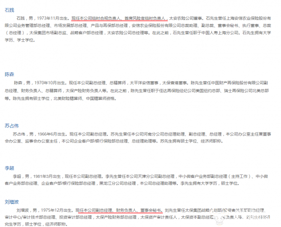 目前,在太保产险官网之上,刘增波的职务已变为副总经理、财务负责人、董事会秘书。但是,与他同期上任的石践职务尚未变动,依旧是临时合规负责人。