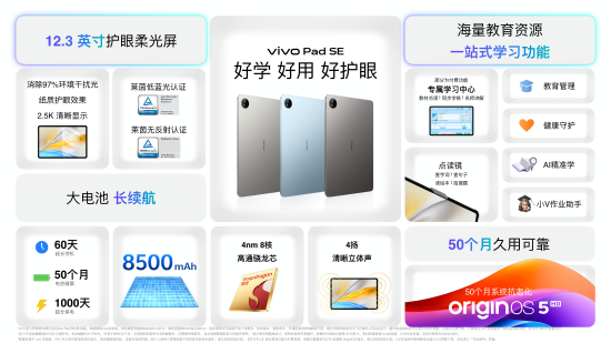 同期发布的IoT新品中,vivo Pad5 Pro搭载安卓平板全球首发的蓝晶×天玑9400芯片,安兔兔综合跑分突破290万大关,是大屏移动游戏与轻办公生产力的新选择,售价2999元起;vivo Pad SE则定位学习平板,配备纸感护眼屏,售价999元起。vivo WATCH 5专注健康监测与运动指导,售价799元起。