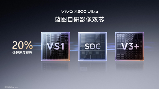 vivo在X200 Ultra上推出两颗自研蓝图影像芯片——V3+和VS1,并借此实现了从前端Raw域数据开始直至照片生成的全链路处理。V3+芯片采用SoC后置架构,为影像、影音播放及游戏多场景带来持续的性能提升;VS1芯片则是前处理大算力AI ISP影像芯片,它与V3+后处理影像芯片组成了行业领先的蓝图影像双芯,进一步提升了影像效果的上限。
