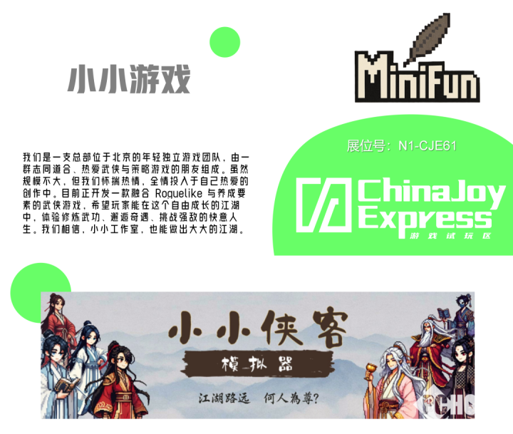 去年ChinaJoy Express游戏试玩区(CJE)共聚集参展团队27家带来47款游戏产品参与试玩。打卡玩家超过10000人,累计试玩超过4000次。今年我们将升级从2024 年300㎡ 47个展位,升级到360 ㎡ 68 个展位,为更多全球中小游戏开发团队提供更好的体验和舞台。