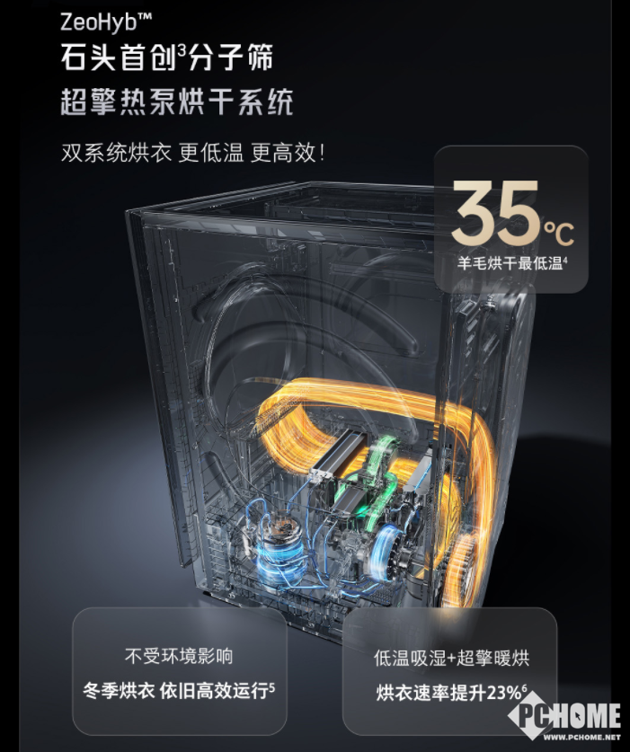 在智能家居领域不断探索创新的石头科技,没有满足于行业现有的技术水平,而是对行业通用热泵烘干技术进行了改良和革新,将自研的分子筛低温烘干技术与超擎热泵技术相结合,推出ZeoHyb™分子筛超擎热泵烘干技术解决方案,为洗烘套装产品带来了全新的技术突破。