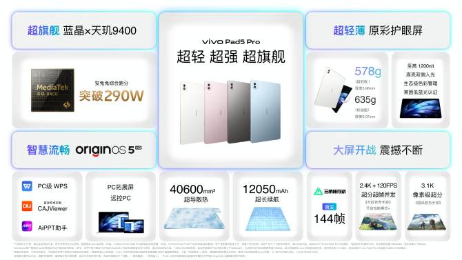 vivo Pad5 Pro作为“安卓超旗舰性能平板”,搭载安卓平板全球首发的蓝晶×天玑9400芯片,安兔兔综合跑分突破290万大关,实力演绎安卓平板性能的超强形态;再配合超轻薄原彩护眼屏,打造全场景超强显示体验。系统级蓝心大模型赋能,以及 PC 级 WPS 等专业适配,是大屏移动游戏与轻办公生产力的新选择。vivo Pad5 Pro已在vivo官网及各大电商平台开启预售,云霞粉、春潮蓝、与寒星灰三种配色将于4月25日正式开售,价格2999元起;vivo Pad5 Pro超轻版轻羽白配色将于4月29日限时开售。首销期间在各大电商平台购机可享国补优惠,低至2549.15元起。