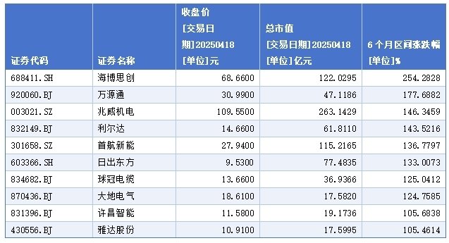 从二级市场表现看,截至4月18日收盘,近6个月来,已经出现10**股,具体包括海博思创、万源通、兆威机电、利尔达、首航新能、日出东方、球冠电缆、大地电气、许昌智能、雅达股份。其中,海博思创近6个月区间涨幅高达254.28%。