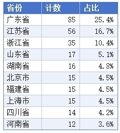 从地域分布看,根据省份划分,广东有85家,占比25.4%;江苏有56家,占比16.7%;浙江有35家,占比10.4%。