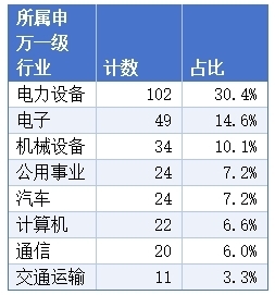 从行业分布看,根据申万一级行业,电力设备有102家,占比30.4%;电子有49家,占比14.6%;机械设备有34家,占比10.1%。