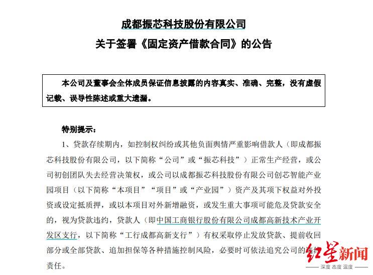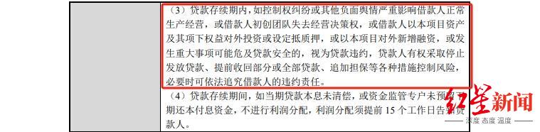 值得注意的是,合同中规定,在贷款存续期内,如公司控制权纠纷或其他负面舆情严重影响公司正常生产经营,或公司初创团队失去经营决策权,或公司上述产业园项目资产及其项下权益对外投资或设定抵质押,或以该项目对外新增融资,或发生重大事项可能危及贷款安全的,视为贷款违约。