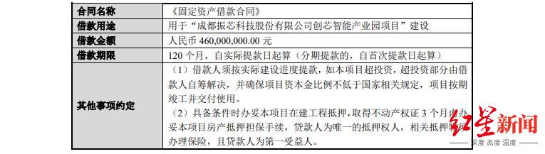 红星资本局4月21日消息,上市公司成都振芯科技股份有限公司(简称“振芯科技”,300101.SZ)近日公告,公司已于4月15日与中国工商银行股份有限公司成都高新技术产业开发区支行签署《固定资产借款合同》,贷款额度为人民币4.6亿元,贷款期限不超过10年。