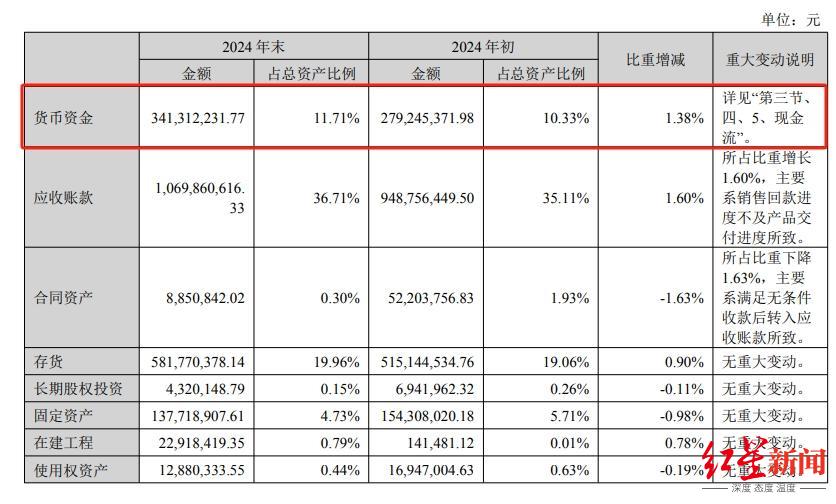 截至2024年末,公司总资产为29.14亿元,同比增长7.85%。其中货币资金3.41亿元,应收账款10.7亿元,存货5.82亿元,短期借款3.65亿元。