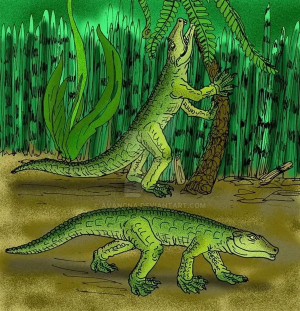 (上图)这也是鳄鱼,它是奇美拉鳄,它们的四肢直立且相当长,最重要的是,它们是植食性的,它们会用后肢支撑身体,前肢趴在树上吃树叶,通过它们的牙齿可以得知它们像现代食草哺乳动物一样咀嚼食物,这些鳄鱼在大约1亿年前灭绝。
