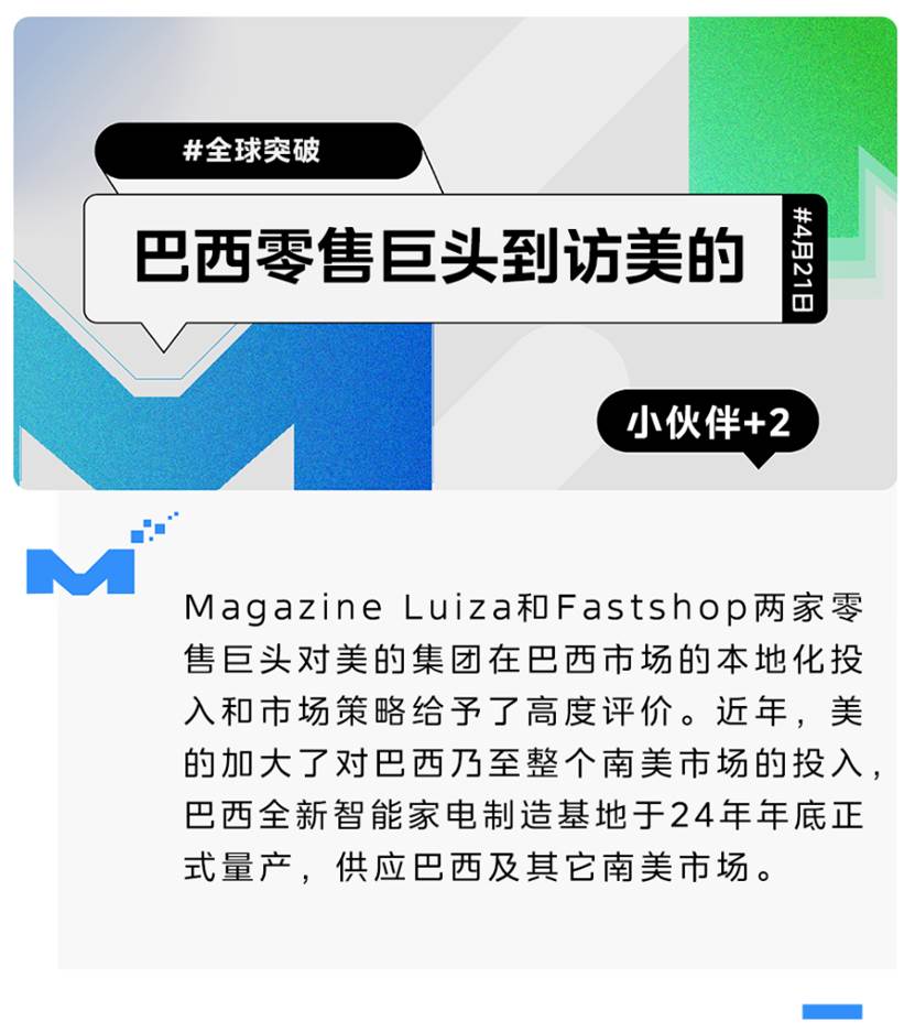 Magazine Luiza和Fastshop两家零售巨头对美的集团在巴西市场的本地化投入和市场策略给予了高度评价。近年,美的加大了对巴西乃至整个南美市场的投入,巴西全新智能家电制造基地于24年年底正式量产,供应巴西及其它南美市场。美的也加大了品牌建设投入,成为南美杯官方赞助商,与当地用户共情互动。