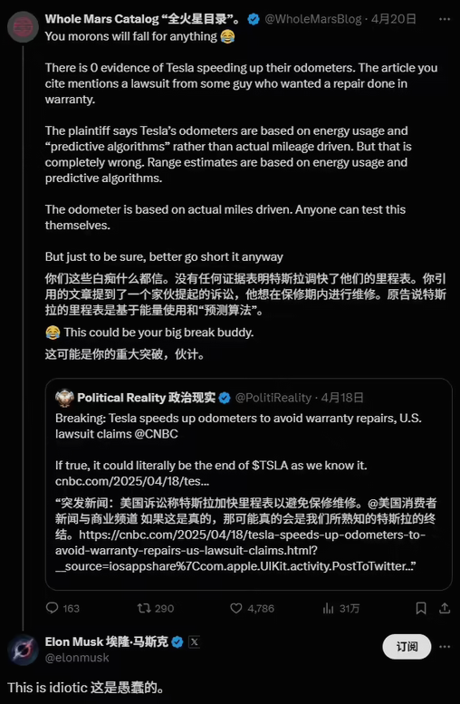 对此,马斯克也在社交媒体平台X上对这起诉讼进行了尖锐批评,称其“太愚蠢了”。
